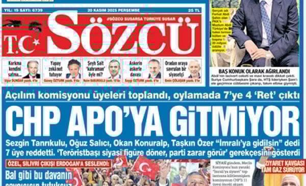 CHP lideri Özgür Özel açılım komisyonunun CHP’li üyeleri ile dün bir araya geldi. Toplantıda “İmralı heyetine katılmayalım” görüşü ağır bastı. Karar bugün oylama öncesi açıklanacak. Bir alternatif olarak CHP’nin komisyonun İmralı’ya gitmesine onay vereceği ancak üye vermeyip heyete katılmayacağı da değerlendirildi.